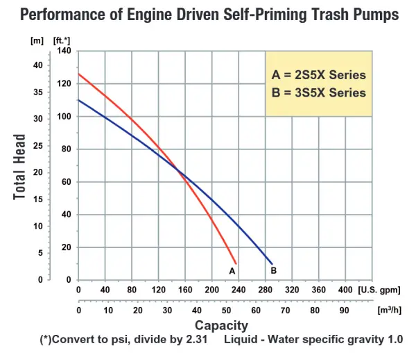 AMT Portable High Volume, Self-priming Centrifugal Trash pumps come standard with a cast iron impeller to resist abrasion and one tool serviceability for easy cleanout. Pumps are designed to handle liquids with solids content or dissolved solids and debris. All pumps feature aluminum housing, cast iron wearparts, built-in check valve, suction strainer and heavy duty steel roll frame. Heavy duty cast iron flanges with male NPT threads that rotates in 90° increments. Easy access fill plug on discharge port.